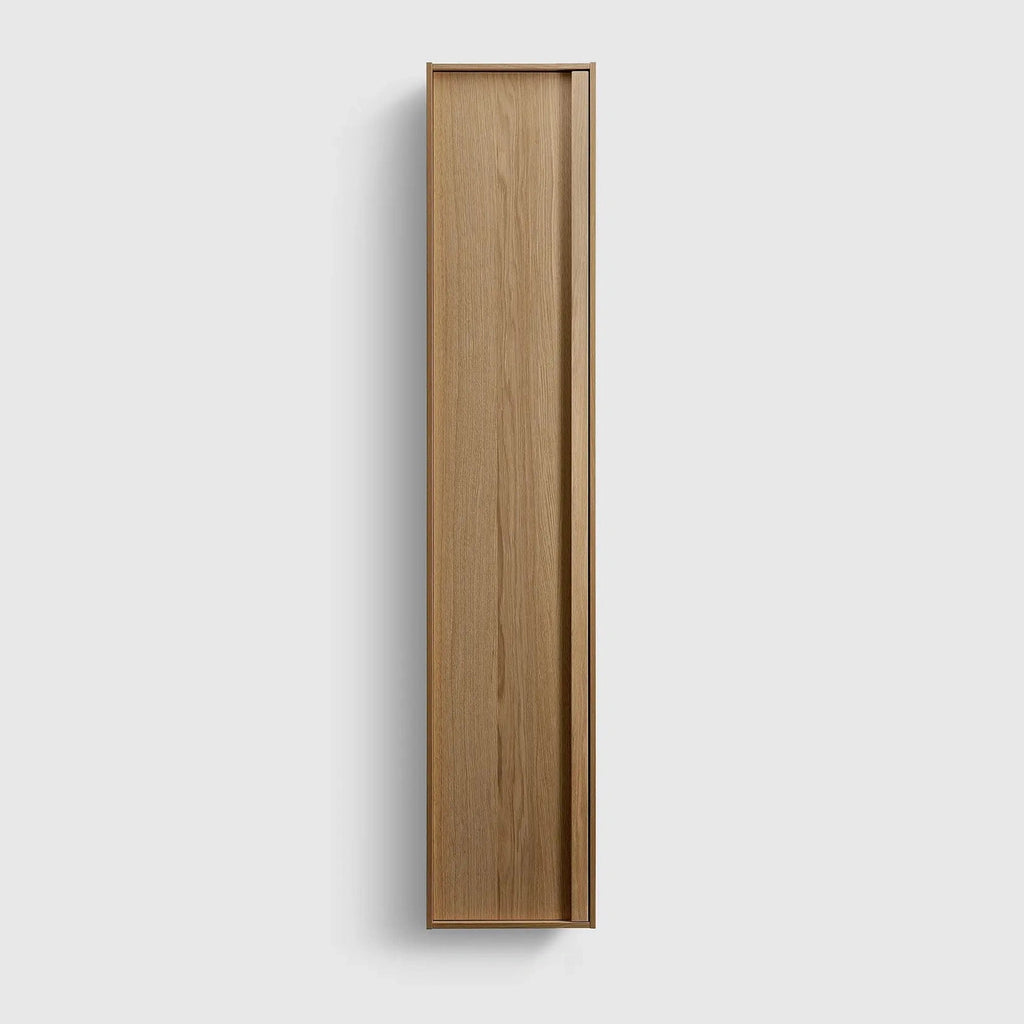 Elegant højskab i ægte træfiner med integreret grebslist og fire perforerede hylder. Let at montere takket være den justerbare ophængsskinne.