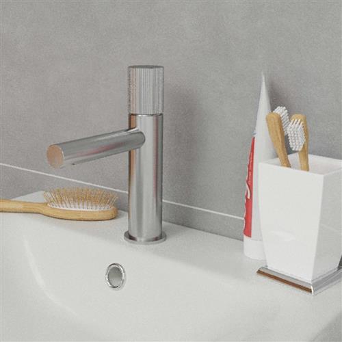 Håndvaskarmatur i et moderne, nytænkende design, hvor det elegante runde greb uden grebspind fuldender det cylindriske udtryk fra armaturets krop.