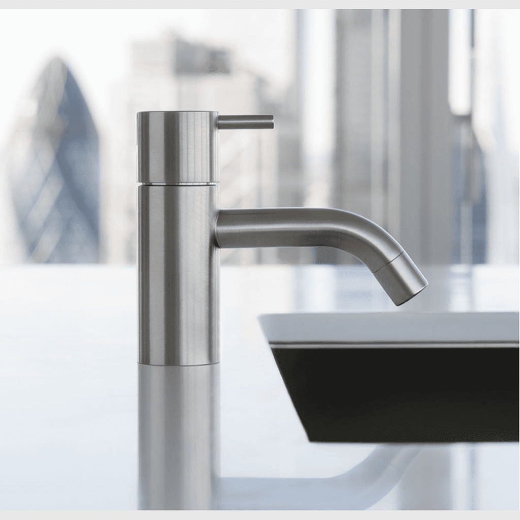 VOLA HV1 håndvaskarmatur. Et-grebsblander med keramisk ventilenhed, fast tud med vandbesparende luftindblander. Til montering i bordpladen.