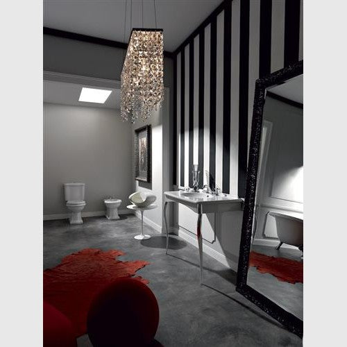 Et elegant gulvstående toilet med cisterne fra Retro-serien, designet af Alfredo Anzellini & Massiliano Cicconi. Toilettet kombinerer klassisk vintage-æstetik med praktisk, pladsbesparende funktionalitet. Det karakteristiske sidehåndtag styrer skyllemængden på 3 eller 6 liter.