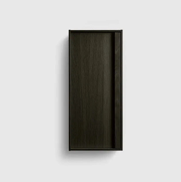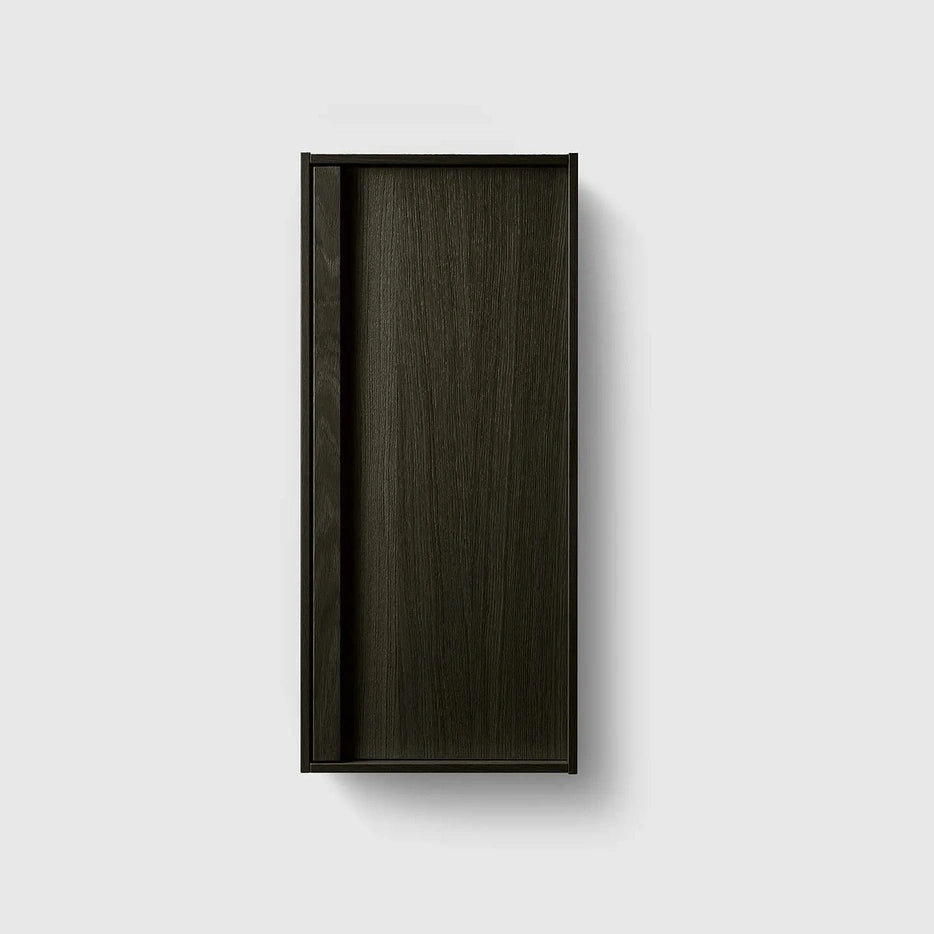 Vægskab udført i ægte træfiner med integreret greb og hylder med perforering. Monteres nemt med justerbar ophængsskinne. Dybde: 200 mm.