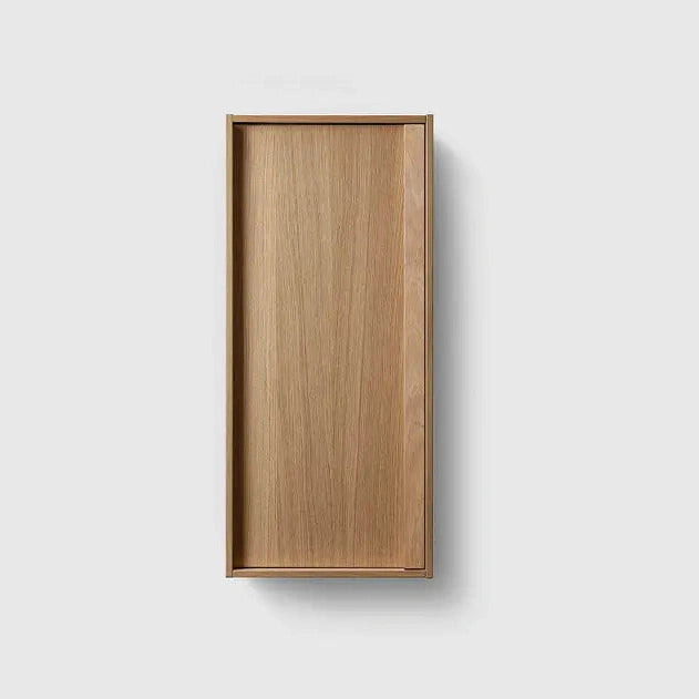 Vægskab udført i ægte træfiner med integreret greb og hylder med perforering. Monteres nemt med justerbar ophængsskinne. Dybde: 200 mm.